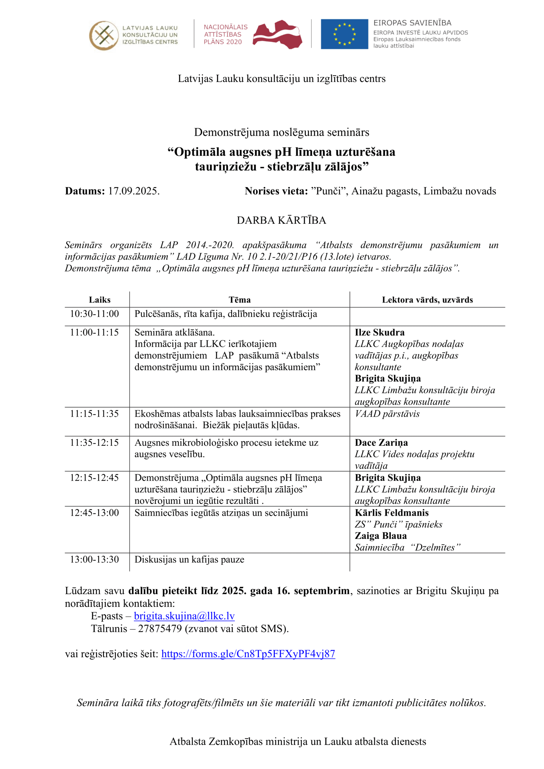 Lūdzam savu dalību pieteikt līdz 2025. gada 16. septembrim, sazinoties ar Brigitu Skujiņu pa norādītajiem kontaktiem: