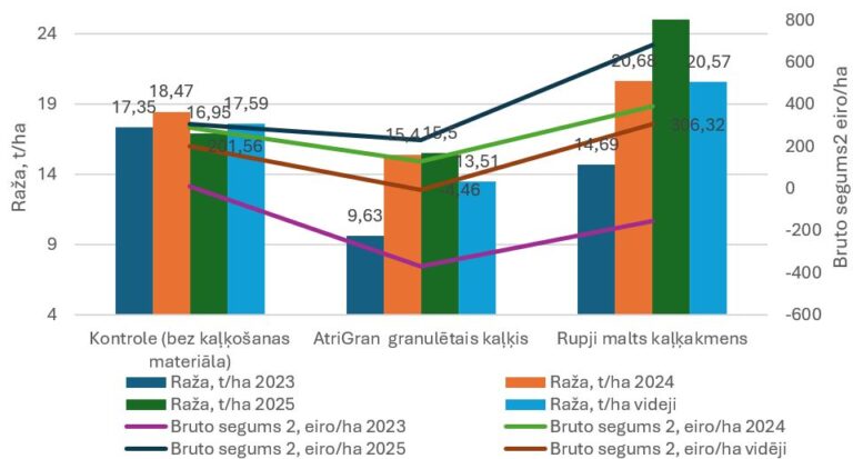 Ielabojot augsni ar kaļķojamiem materiāliem, zemnieks cer iegūt lielāku un kvalitatīvāku ražu, tādēļ arī mēs demonstrējumā noteicām katra varianta ražību (2. tab.) un ražas kvalitāti. Sējas gadā bija ļoti sauss un karsts laiks, iesētais zālājs slikti dīga un tā kā nezālēm nebija nekādas konkurences, tad pirmā gada raža sastāvēja no nezālēm. Kontroles varianta ražas katru gadu bijušas diezgan stabilas, jo gada sausajos mēnešos – aprīlis, maijs, jūnijs (2023. un 2024.) – izšķirošais faktors, kas nodrošināja šī varianta stabilo ražu bija pieejamais mitrums, jo lauka daļa ar kontroli atrodas nedaudz zemākā vietā kā pārējā. Variantā, kurā lietots rupji malts kaļķakmens, raža, sākot ar otro un trešo gadu pēc kaļķošanas, sāk pieaugt, jo augsnes reakcija ir izmainījusies un līdz ar to āboliņa–stiebrzāļu zālājam nodrošināti labvēlīgāki augšanas apstākļi – lēnās iedarbības kaļķojamais materiāls ir uzlabojis augsnes struktūru, tā ir irdenāka, nav sablīvējusies, labāk piesaista mitrumu un mazina klimatisko apstākļu radīto stresu augiem. 2023. un 2024. gadā veikti divi pļāvumi, bet 2025. gadā raža pagaidām novākta vienu reizi, bet sekos arī otrs pļāvums.