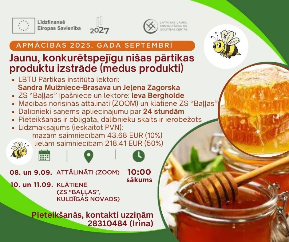 Latvijas Lauku konsultāciju un izglītības centrs (LLKC) Liepājas birojs sadarbībā ar Latvijas Biozinātņu un tehnoloģiju universitāti (LBTU) un ZS “Baļļas” aicina uz ES apmaksātām apmācībām ar līdzmaksājumu Jaunu, konkurētspējīgu nišas pārtikas produktu izstrāde (medus produkti). Grupas nr. LLKC23Lp17-M.