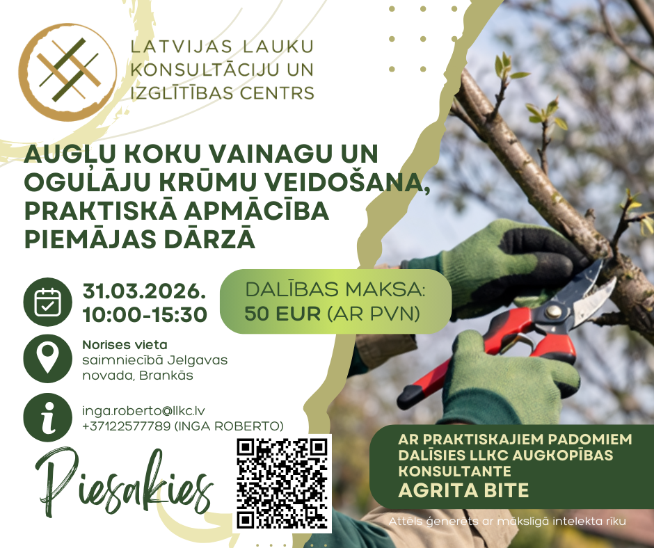 Aicinām piedalīties klātienes mācībās “Augļu koku vainagu un ogulāju krūmu veidošana, praktiskā apmācība piemājas dārzā”