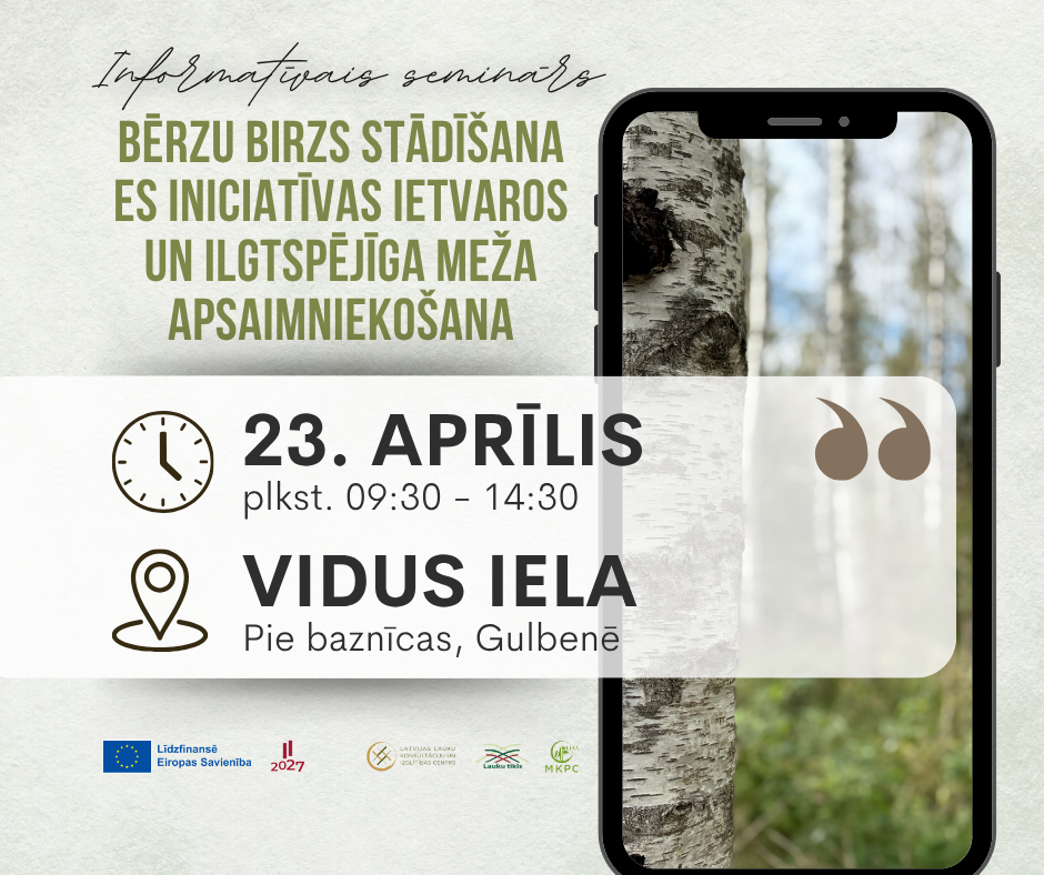 MKPC Madonas nodaļa aicina pieteikties informatīvajam semināram ar plašu programmu: “Bērzu birzs stādīšana ES iniciatīvas “Par 3 miljardiem koku vairāk” ietvaros. Izzinoša pastaiga pa jaunaudzēm (koptas ar ES atbalstu). Slapju vietu apmežošanas iespējas.”