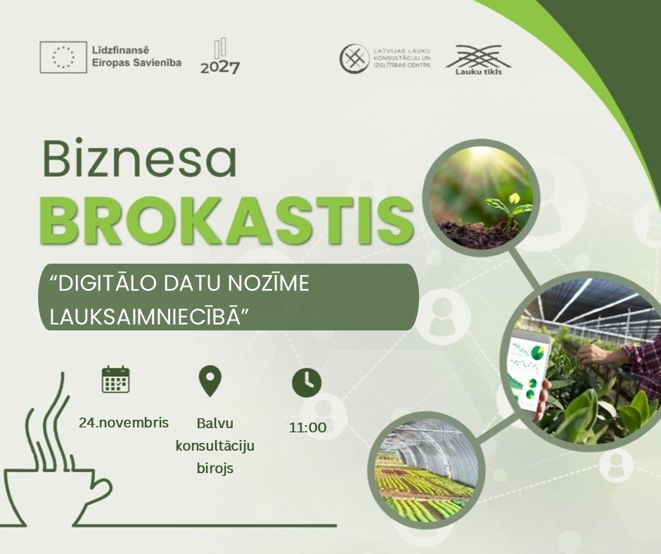 Aicinām Jūs uz “Biznesa brokastīm” 24.novembrī plkst. 11:00 Balvu konsultāciju birojā. Tikšanās tiek organizēta ar mērķi veicināt lauku uzņēmēju zināšanu apmaiņu par digitālo datu nozīmi lauksaimniecībā, apgūstot prasmes darbā ar lauku saimniecību pārvaldības sistēmu “Mans lauks”. Uzzināsiet daudz noderīgas informācijas – kā sagatavot un iesniegt atskaites – ekoshēmas, atskaišu žurnālus u.c.? Kas ir daudzgadu konsultāciju pakalpojums “Inkubators”? Kādas iespējas un labumi tiek piedāvāti saimniekiem, iesaistoties šajā projektā?