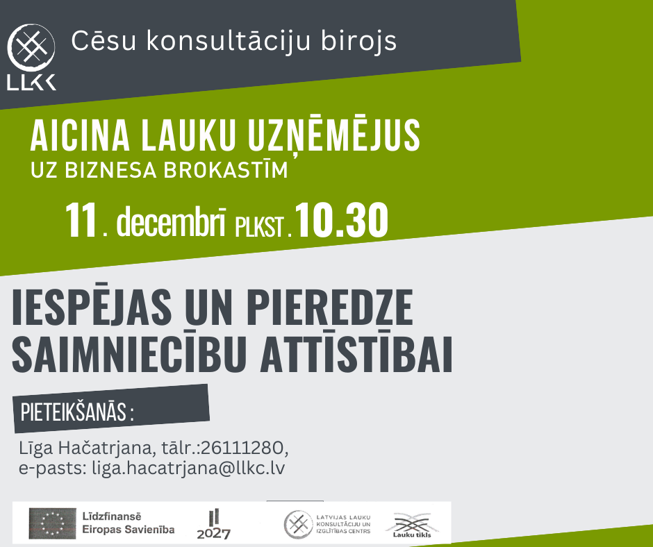 Aicinām lauku uzņēmējus uz tikšanos 11.decembrī plkst. 10:30, Cēsīs, Bērzaines ielā 5, 1.stāva zālē.