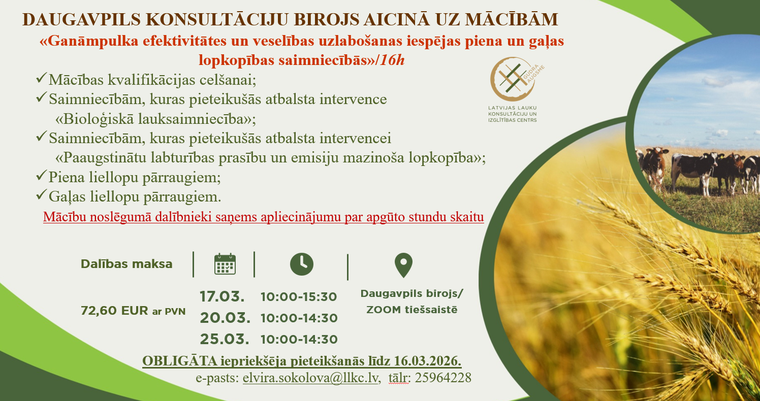 LLKC Daugavpils biroja uzņēmejdarbības konsultante Elvīra Sokolova, e-pasts: elvira.sokolova@llkc.lv