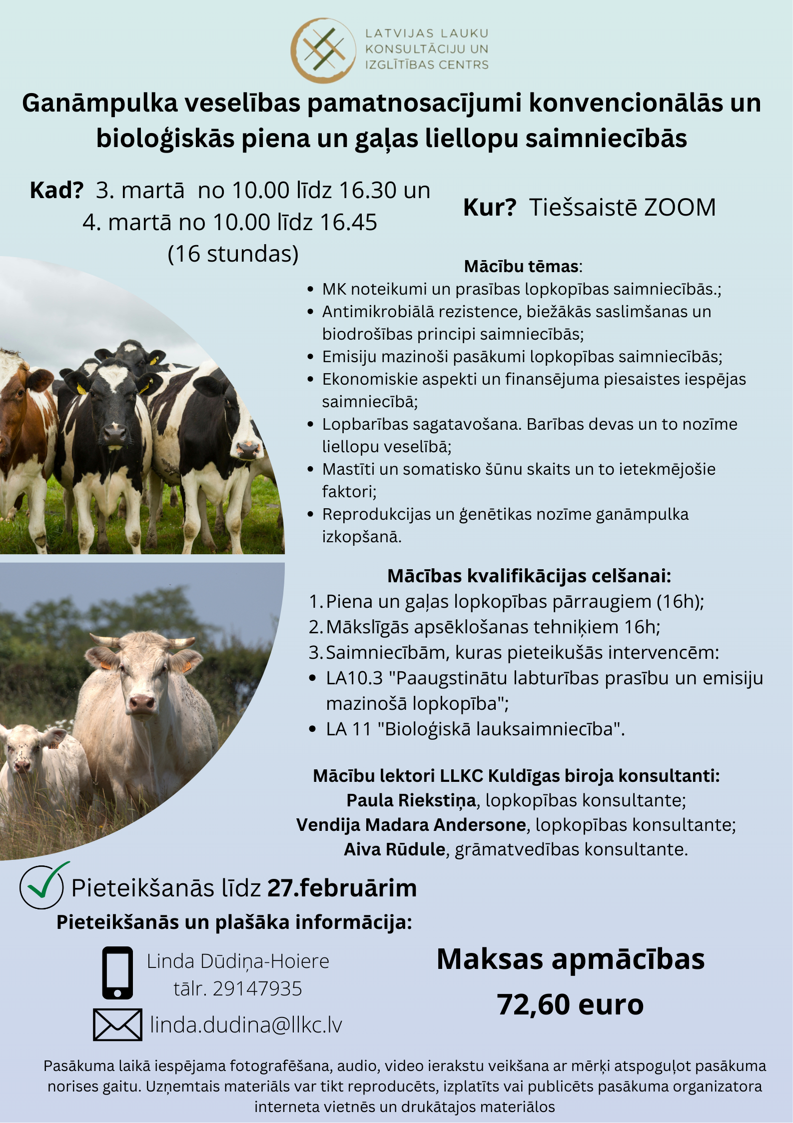 LLKC Kuldīgas konsultāciju birojs aicina uz maksas mācībām 03.03.2026 un 04.03.2026 Zoom tiešsaites platformā. Par tēmu: Ganāmpulka veselības pamatnosacījumi konvencionālās un bioloģiskās piena un gaļas liellopu saimniecībās (16h)