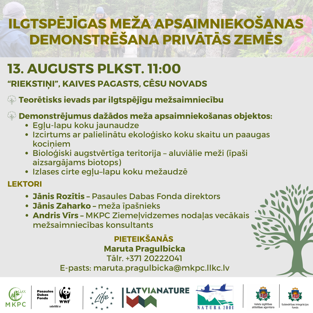 Projekta LIFE IP LatViaNature aktivitātes E.3.1. ietvaros meža īpašnieki, nozares speciālisti un citi interesenti tiek aicināti uz praktisku semināru, kurā tiks demonstrēti ilgtspējīgas mežsaimniecības piemēri privātā īpašumā, līdzsvarojot bioloģiskās daudzveidības saglabāšanu un meža ekonomiskos ieguvumus.