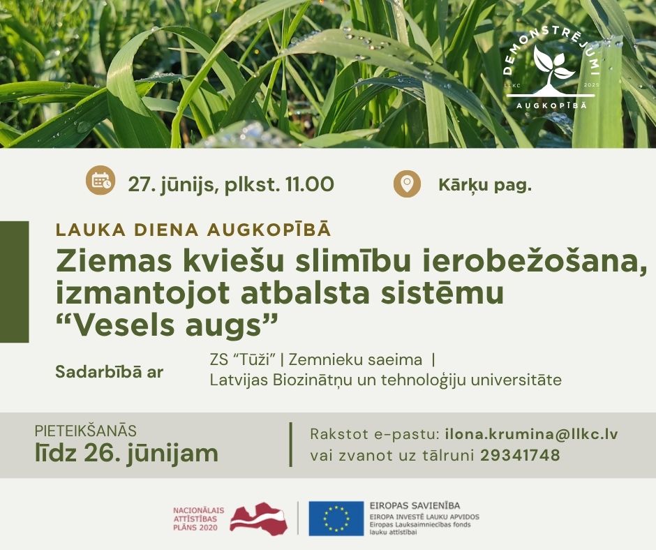 LLKC sadarbībā ar zemnieku saimniecību “Tūži” (Kārķu pagasts, Valkas novads), biedrību Zemnieku saeima un Latvijas Biozinātņu un tehnoloģiju universitāti aicina apmeklēt lauka dienu „Ziemas kviešu slimību ierobežošana, izmantojot atbalsta sistēmu “Vesels augs”.