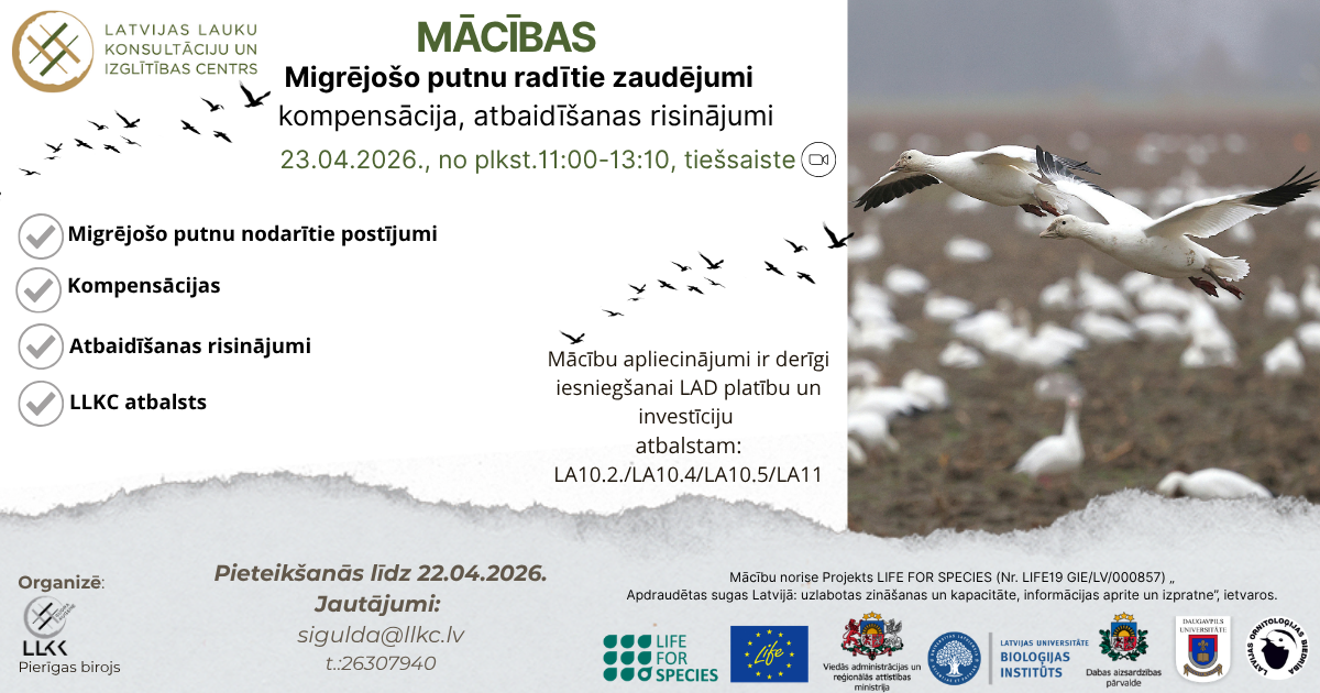 Praktiskas mācības par aktuālajām metodēm migrējošu putnu radīto zaudējumu risinājumiem.