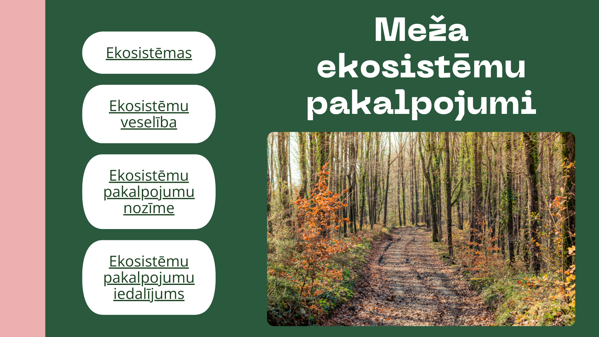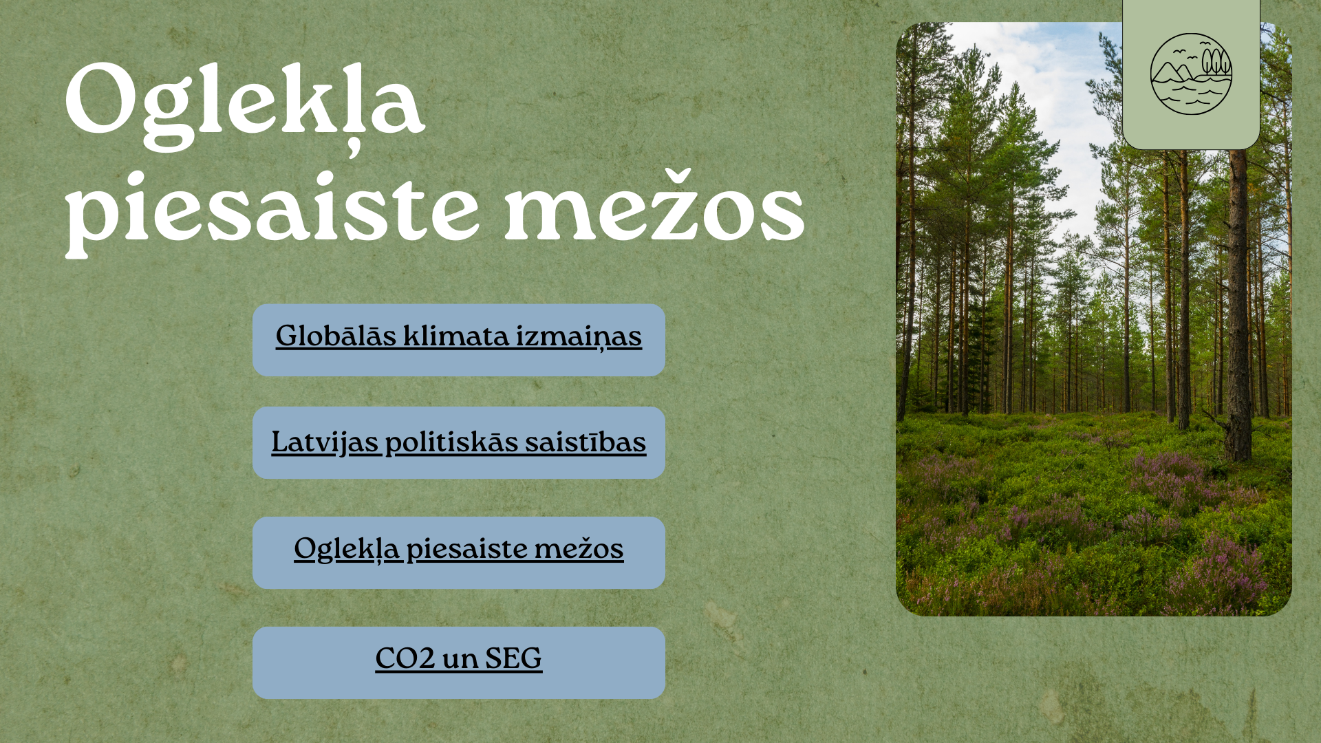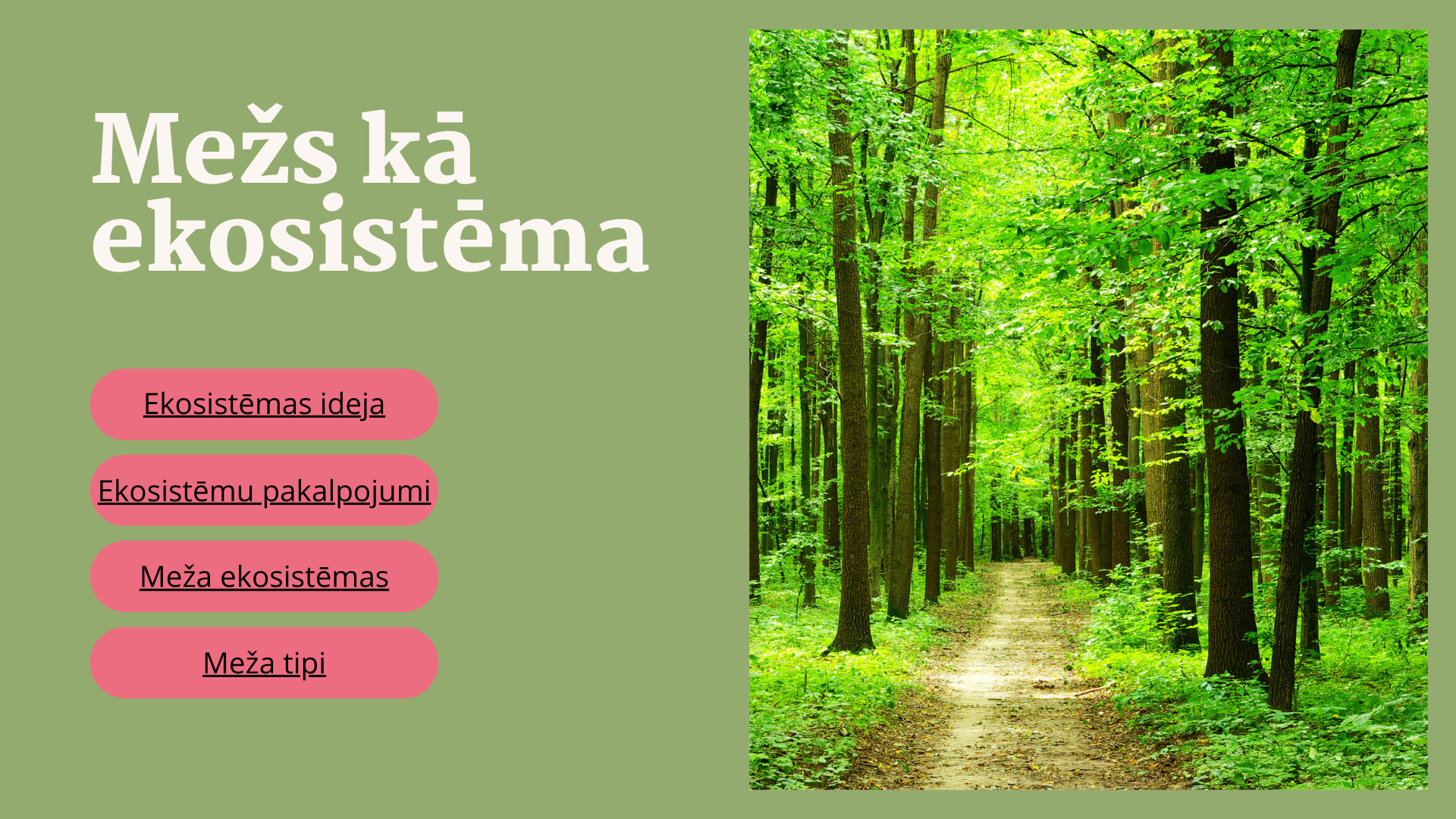 Mācību materiāls paredzēts, lai jebkurš interesents pašmācībā apgūtu pamatzināšanas par meža ekosistēmām. Visi mācību materiāli ir pieejami bezmaksas.