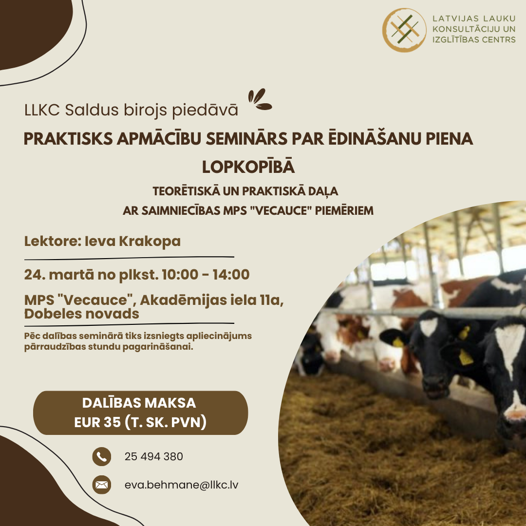 LLKC Saldus konsultāciju birojs aicina uz praktisku apmācību semināru par ēdināšanu piena lopkopībā.