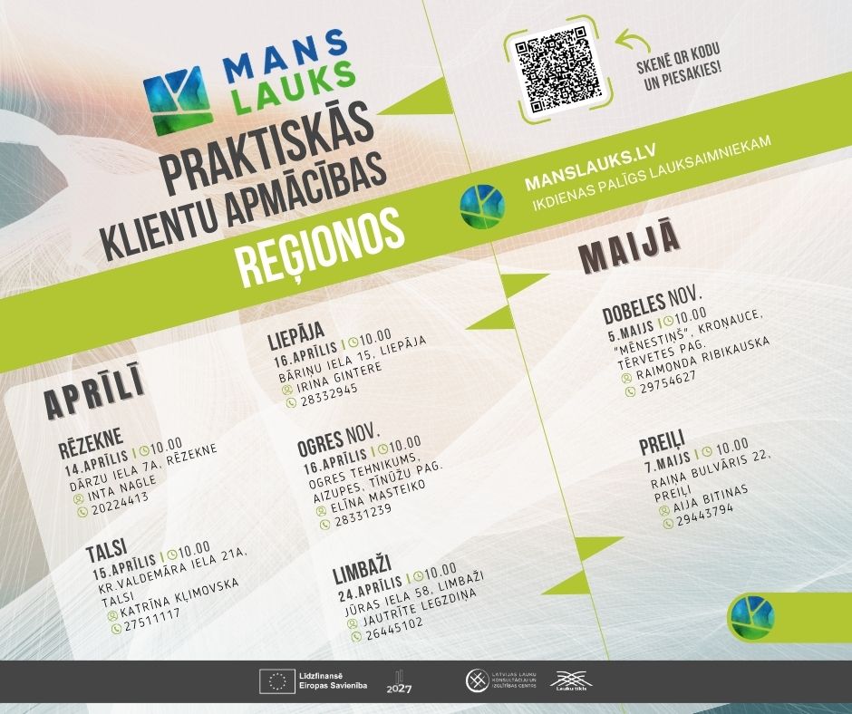Lauksaimnieki visā Latvijā aicināti piedalīties klātienes praktiskajās apmācībās par lauku saimniecību pārvaldības sistēmu “Mans Lauks”. Apmācības paredzētas gan saimniecību īpašniekiem, gan darbiniekiem, ja tie ikdienā plāno strādāt ar sistēmu “Mans Lauks”.