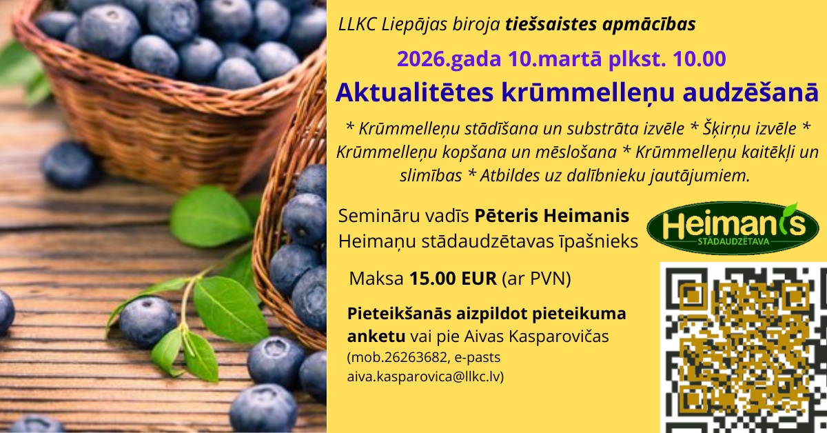 LLKC Liepājas konsultāciju birojs aicina uz tiešsaistes (ZOOM) maksas apmācībām “Aktualitātes krūmmelleņu audzēšanā” .