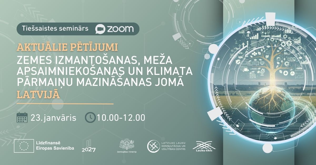 23. janvārī plkst. 10.00 Zoom platformā norisināsies Zemkopības ministrijas un Lauksaimniecisko zināšanu un inovācijas sistēmas (AKIS) Sekretariāta organizētais tiešsaistes seminārs “Aktuālie pētījumi zemes izmantošanas, meža apsaimniekošanas un klimata pārmaiņu mazināšanas jomā Latvijā”.